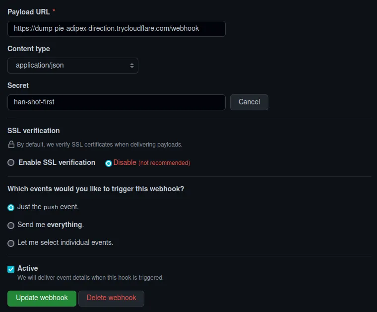 application/jsonas the content type cause we want the payload in JSON. For the secret, you can put any random string but make sure you remember/note what you put there. For the example repository you also have to update your.envfile. Details in the next section.